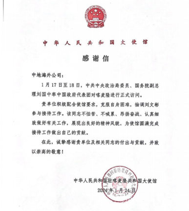 近日,公司收到中國(guó)駐喀麥隆大使館發(fā)來(lái)的感謝信,對(duì)公司及相關(guān)同志在“中國(guó)政府代表團(tuán)對(duì)喀麥隆進(jìn)行正式訪問(wèn)”期間的付出與貢獻(xiàn)表示感謝。