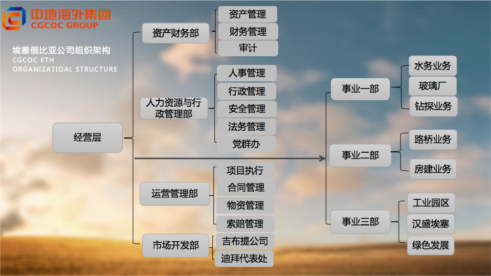 中地海外埃塞俄比亞有限公司是中地海外集團有限公司全資子公司,成立于2003年,具備一級工程總承包資質(zhì)。中地海外埃塞公司是一個涉及公路、橋梁、房建、城市供水、污水處理、深井鉆探、農(nóng)業(yè)、貿(mào)易物流、電力、工業(yè)園區(qū)建設(shè)等領(lǐng)域的大型綜合性企業(yè)。